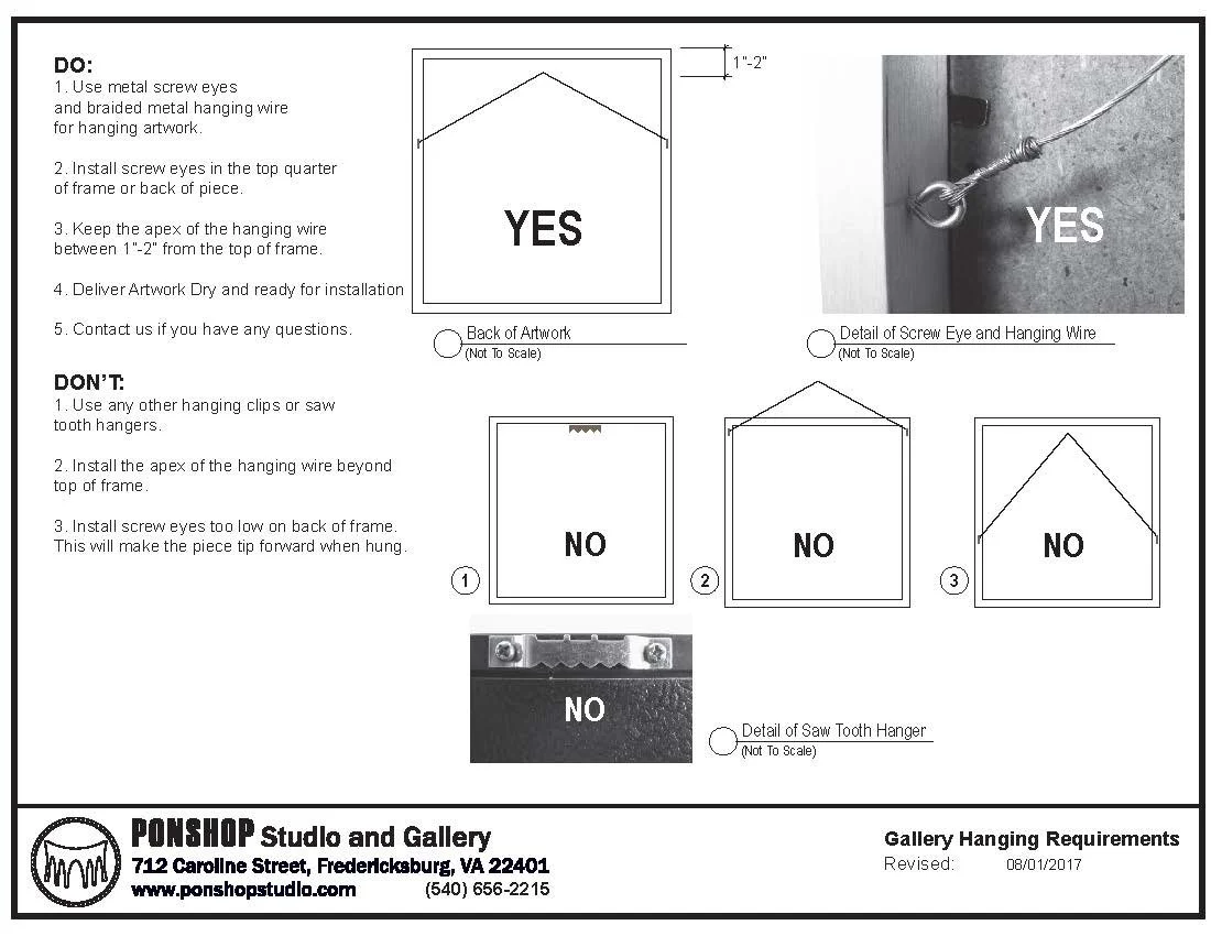 PONSHOP Studio and Gallery is accepting original 2-dimensional artwork in any variety of media. All work must conform to the dimensional limits (no greater than) 36”x36”. Submit your best work! Artwork must be framed and ready to hang in accordance with gallery standards (see image below). The gallery reserves the right to reject artwork based on quality, uniqueness and creativity, craftsmanship, and execution. Entries must be original creations of the artist – no reproductions of others artwork.